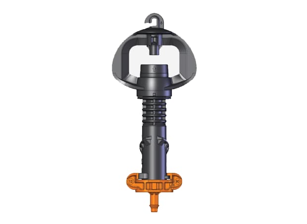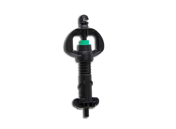 SuperNet™ UD flow-regulated “upside down” mounted micro-sprinkler, keeps the ground clear preventing sprinkler damage by field machinery.